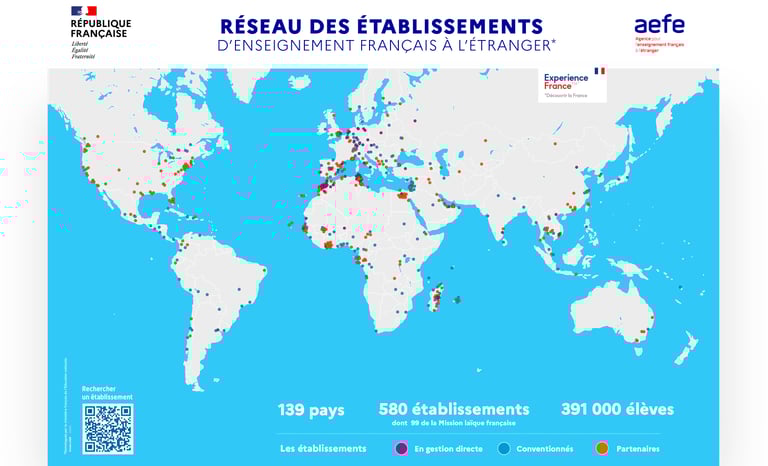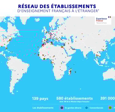 A l’étranger le réseau des établissements d’enseignement français est constitué de 580 établissements dans 139 pays.