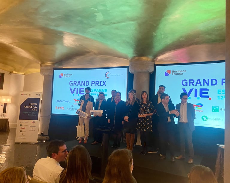 Le 10 décembre s’est déroulé à Barcelone, la 12ème édition du Grand Prix V.I.E. d’Espagne. Cet événement, organisé par Business France et le comité Espagne des conseillers du commerce extérieur de la France, récompense chaque année de jeunes diplômés qui participent au dispositif V.I.E. (Volontariat International en Entreprises) en Espagne, en présentant des projets dans les catégories Innovation, créativité et développement durable, Implantation et ouverture de marché, Performance commerciale et financière.